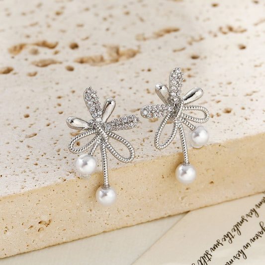 Pearl & Zircon Bow-Knot Earrings - Gold Plated Dainty Jewellery